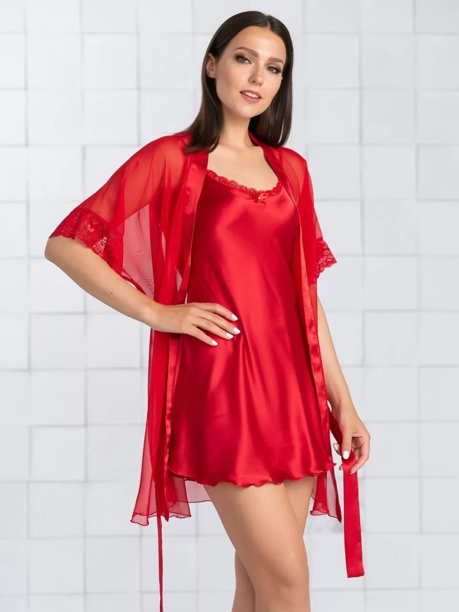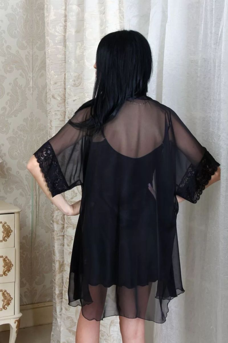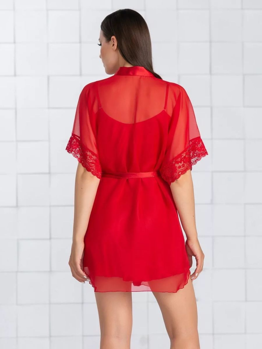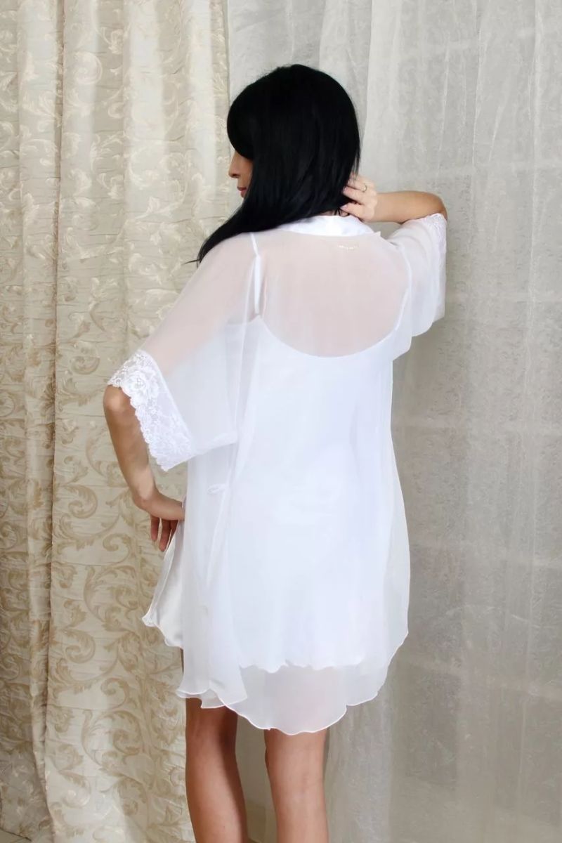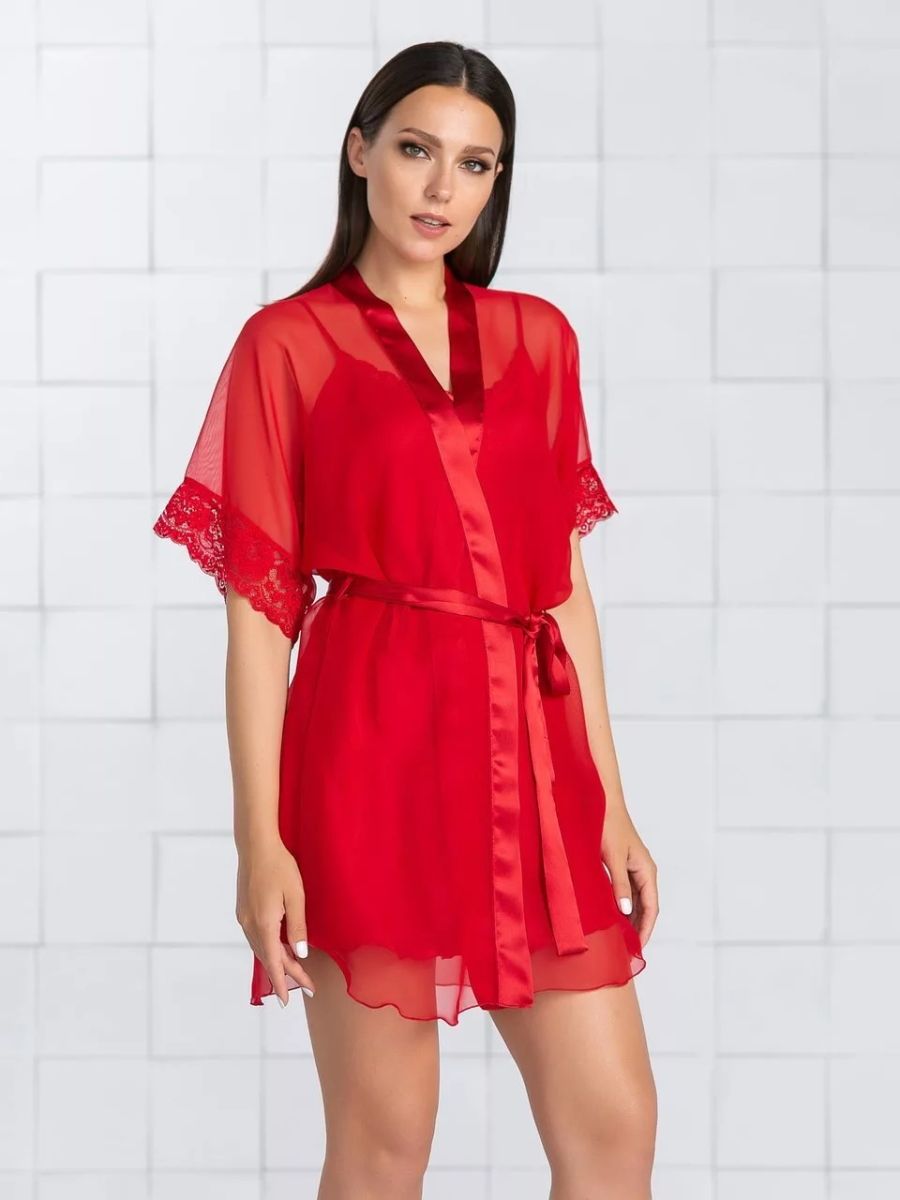 Легкий шифоновый халатик покроя кимоно, с запахом под пояс. Пояс и планка по борту выполнены из искусственного шелка, рукав короткий с эластичным кружевом по низу в тон ткани.