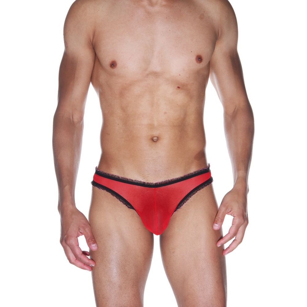 Бразилиана для мужчин из полупрозрачной красной ткани. Окантованы узкой маленькой черной рюшей, которая оторочена розовым цветом.