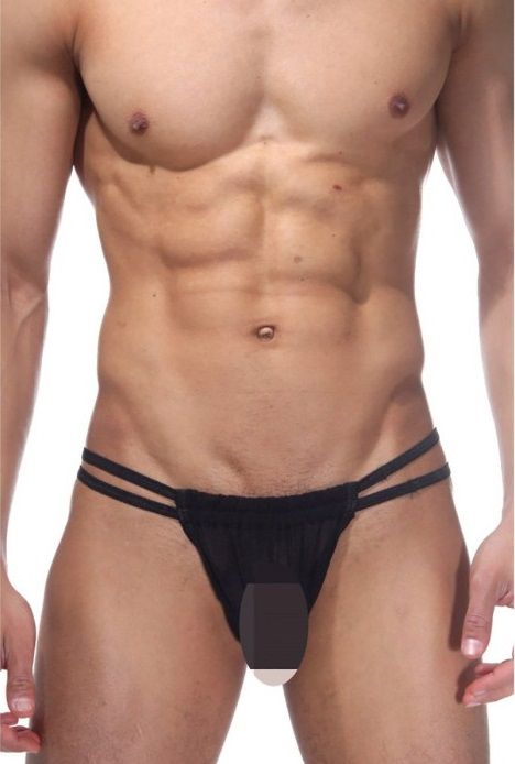 Мужские трусы-танга из полупрозрачной тянущейся ткани. По бокам двойные резинки, трусы с вырезом.