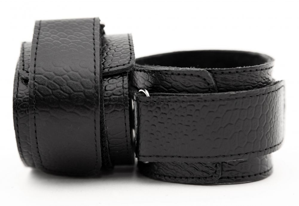 Кожаные наручники черного цвета. Украшены заклепками и соединяются между собой цепью с карабинами. Размер наручников регулируется при помощи застежки-липучки Ширина - 5 см. Длина цепочки - 15,5 см.
