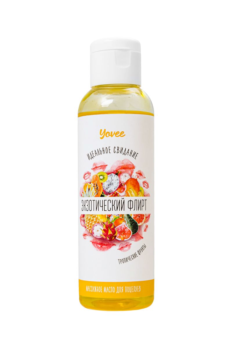 Массажное масло для поцелуев Yovee «Экзотический флирт» со вкусом тропических фруктов сделает свидание незабываемым. Ароматный сладкий массажный продукт дополнит парный романтический вечер или станет сочным уходовым средством для самостоятельного использования. Ощутите, как кожа наполнится влагой, станет мягкой и упругой. Яркий фруктовый аромат опьянит, раскрываясь на горячей коже роскошным шлейфом. Налейте масло в ладони или на кожу, разотрите тонким (!) слоем, чередуя нежные и интенсивные движения. Несмотря на натуральный и безопасный состав масла для поцелуев Yovee «Экзотический флирт» - это концентрат, поэтому не рекомендуется пить масло из флакона. Продукт не подходит для использования в качестве лубриканта.
