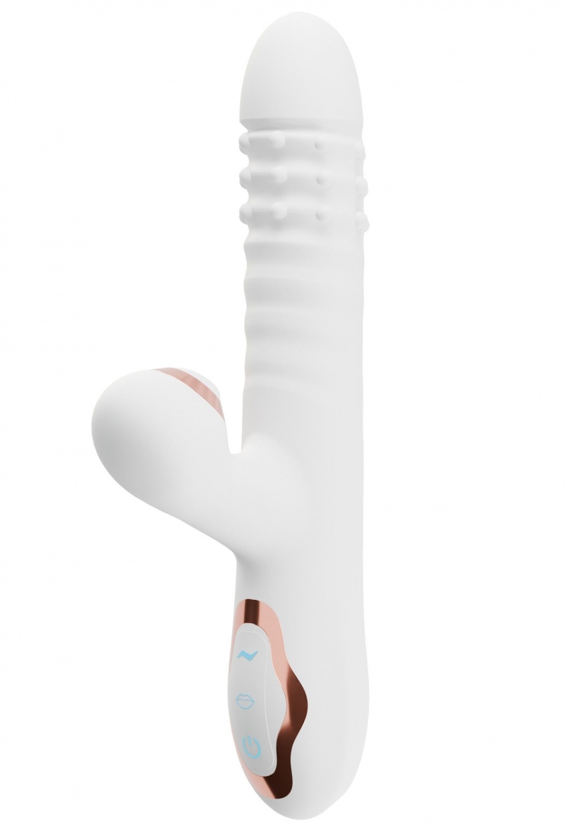 Белый вибратор-кролик с вращающимися шариками и вакуумной стимуляцией. 10 режимов работы. Рабочая длина - 11,5 см.